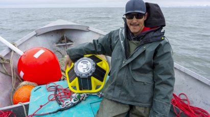 Michael Quuniq Donovan’s crew deploy a wave buoy near Utgiagvik....